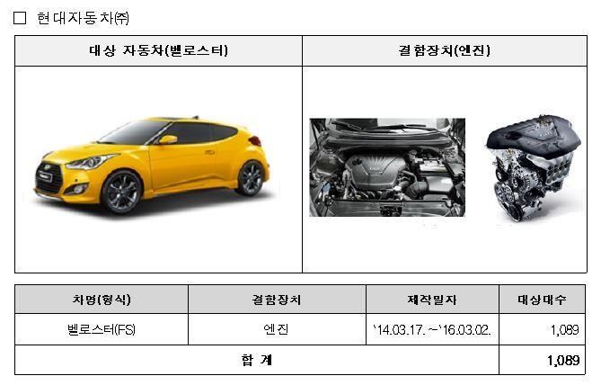 현대차에서 제작·판매한 벨로스터 1천89대는 엔진 내부의 일부 부품이 마모 등 손상된 점으로 인해 간헐적으로 주행 중 시동이 꺼지거나 화재가 발생할 가능성이 확인됐다. 이에 선제적 예방 차원에서 리콜에 들어간다고 국토부는 설명했다.