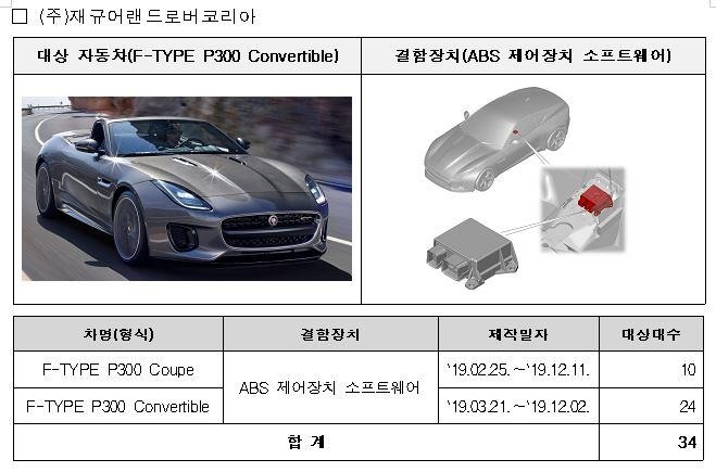 재규어랜드로버코리아에서 수입·판매한 F-TYPE P300 컨버터블 등 2개 차종 34대는 바퀴 잠김 방지식 제동장치(ABS) 소프트웨어 오류로 ABS가 정상 작동되지 않아 제동거리가 길어질 가능성이 확인됐다.