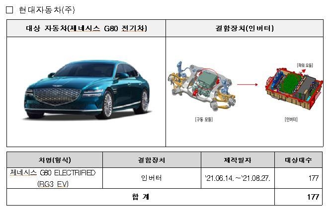 현대차에서 제작·판매한 제네시스 G80 일렉트리파이드 177대는 구동 모터에 전기를 공급하는 인버터 내부 부품이 소손(燒損: 불에 타 훼손)돼 주행 중 시동이 꺼지고, 이후 다시 시동이 걸리지 않을 수 있어 리콜이 결정됐다.