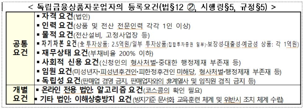 | ▲ 독립금융상품자문업자 등록요건 [금감원 제공] |