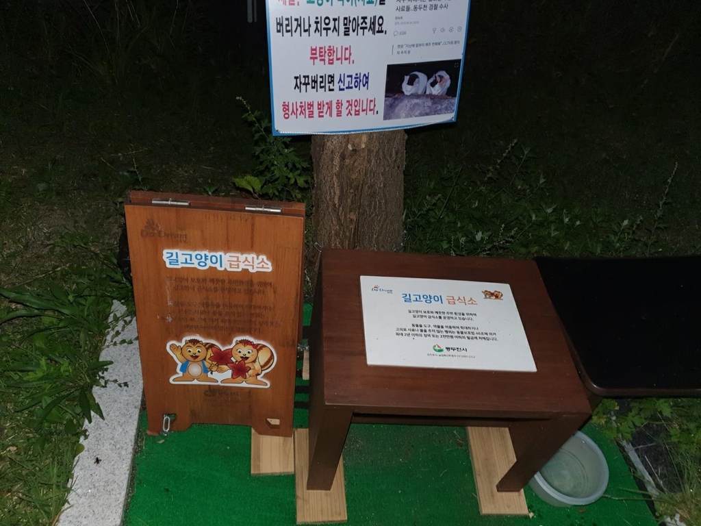 '길고양이 급식소'란 먹이 그릇으로 인해 미관이 지저분하다는 등의 민원을 줄이기 위해 지자체 등에서 직접 설치한 시설물이다.