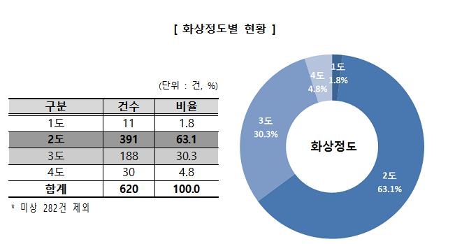 화상 정도를 보면 위해 정도를 확인할 수 있는 620건 중 2∼3주 치료가 필요한 '2도 화상'을 입은 사례가 63.1%로 가장 많았고 '3도 화상'은 30.3%였다.