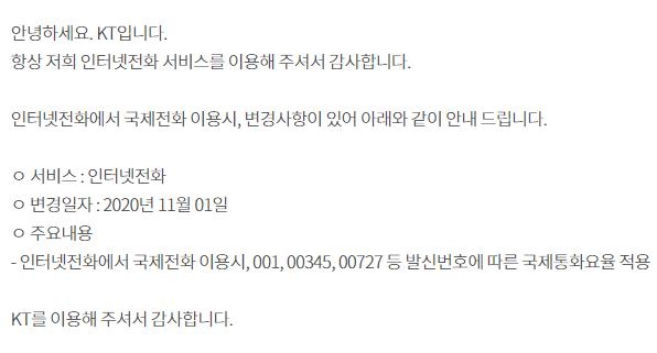 지금까지 KT 인터넷전화에서 001, 00345 등으로 해외의 KT 가입자에게 국제전화를 할 경우 국내통화 수준의 요금이 부과됐지만 이번 개편으로 일반 유선전화나 휴대전화처럼 별도의 국제전화 요율이 적용된 것이다.