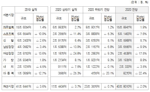 스포츠복 시장은 7.6%, 내의 시장은 3.5% 역성장했지만, 골프복과 잠옷 수요가 늘면서 2019년보다는 각각 3.3%포인트, 0.9%포인트 감소 폭이 줄었다.