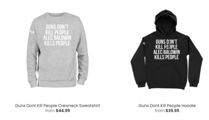 티셔츠에는 '총은 사람을 죽이지 않는다. 알렉 볼드윈이 사람을 죽인다'는 문구가 앞면에 큼지막하게 새겨져 있다.