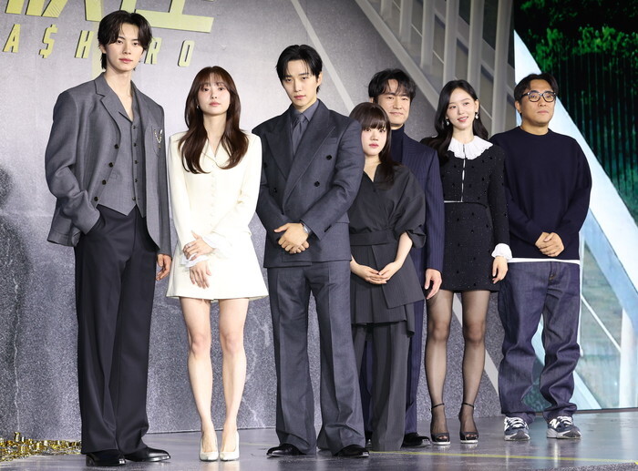 The stars of the drama "Cashero" an original series by Netflix -- Lee Chae-min, Kim Hye-jun, Lee Jun-ho, Kim Hyang-ki, Kim Byung-chul and Kang Han-na (L to 2nd R) -- along with director Lee Chang-min (far R) -- pose for a photo during a publicity event in Seoul on Dec. 22, 2025. The eight-episode series will be released worldwide on Dec. 26. (Yonhap)