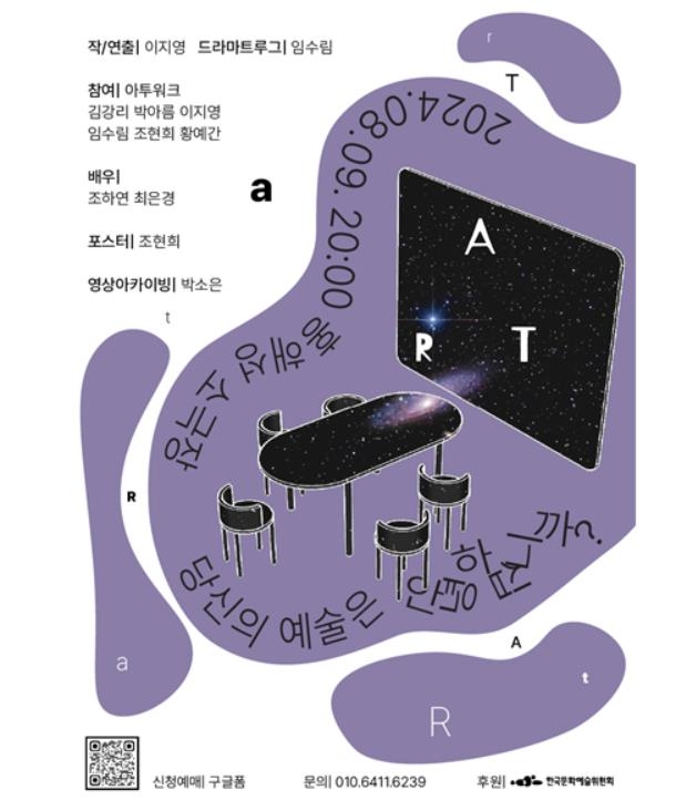 ▲ 예술노동 가치 탐구하는 연극 쇼케이스 = 창작단체 아투워크는 다음 달 9일 서울 대학로 홍해성소극장에서 연극 '당신의 예술은 안녕하십니까'의 쇼케이스를 진행한다. 2024년 한국문화예술위원회 창작의과정 연극 선정작으로 예술노동의 가치를 탐구하는 과정을 담았다. 연극 '뇌 까리다', '정릉사색' 등을 연출한 이지영이 연출을 맡았다. 아투워크는 이번 쇼케이스를 통해 작품을 보완한 뒤 내년에 정식 상연할 계획이다.