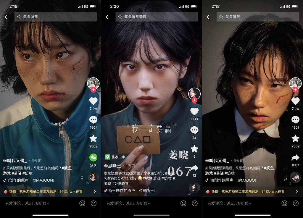 '오징어 게임'의 폭발적인 중국 내 인기는 중국의 젊은이와 청소년들이 많이 이용하는 틱톡의 중국판인 더우인(抖音)에서 가장 쉽게 느낄 수 있다.