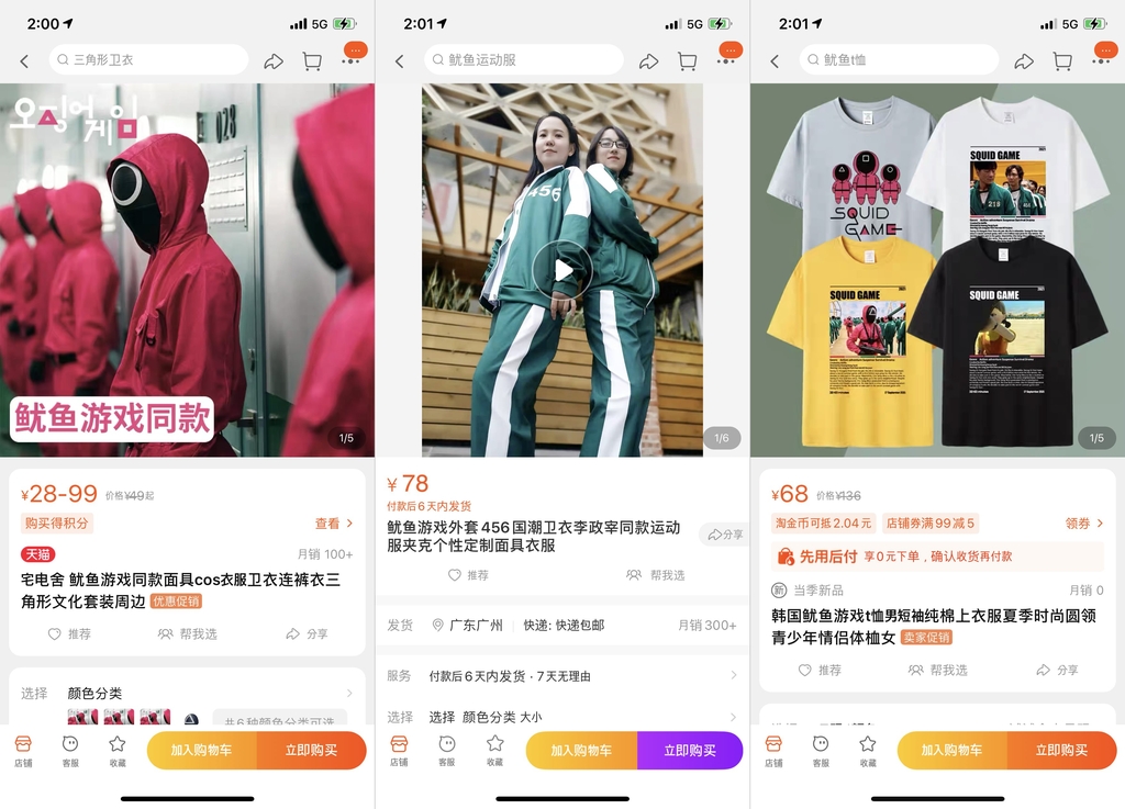한편 '오징어 게임'의 인기가 치솟으면서 타오바오(淘寶) 같은 중국의 전자상거래 사이트에서는 극중 인물들이 게임에 참가했을 때 입은 트레이닝복과 감시자들의 점퍼 수트와 가면과 같은 의상과 소품도 인기리에 팔려나가고 있다.