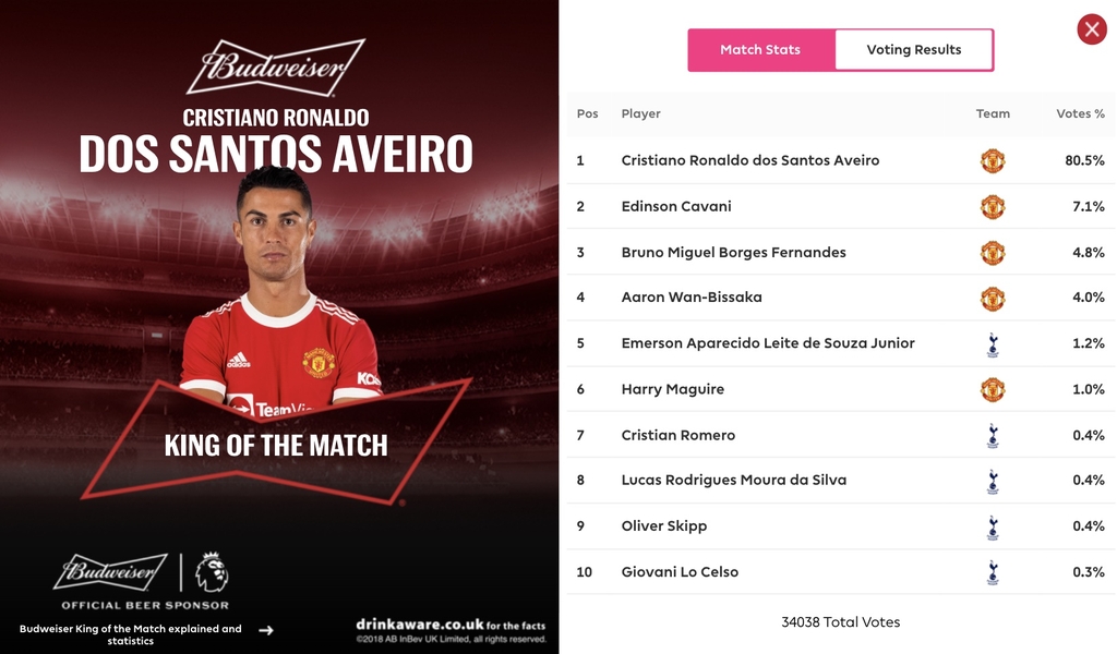 호날두는 공식 최우수선수(MVP) 격인 '킹 오브 더 매치(KOM)'로도 선정됐다. 득표율 80.5%를 기록했다.
