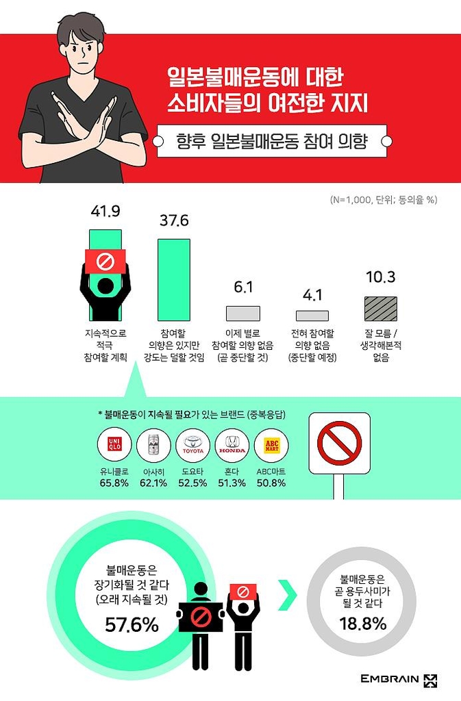 또한 불매운동 장기화를 전망한 응답자는 57.6%로 절반을 넘었지만, 용두사미가 될 것으로 예상한 사람은 18.8%에 그쳤다.