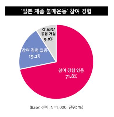 22일 시장조사전문업체 엠브레인 트렌드모니터에 따르면 지난달 27일부터 이달 2일까지 전국 만 19~59세 성인 남녀 1천 명을 대상으로 일본 제품 불매운동에 대한 인식조사를 한 결과 71.8%가 참여 경험이 있다고 답했다.