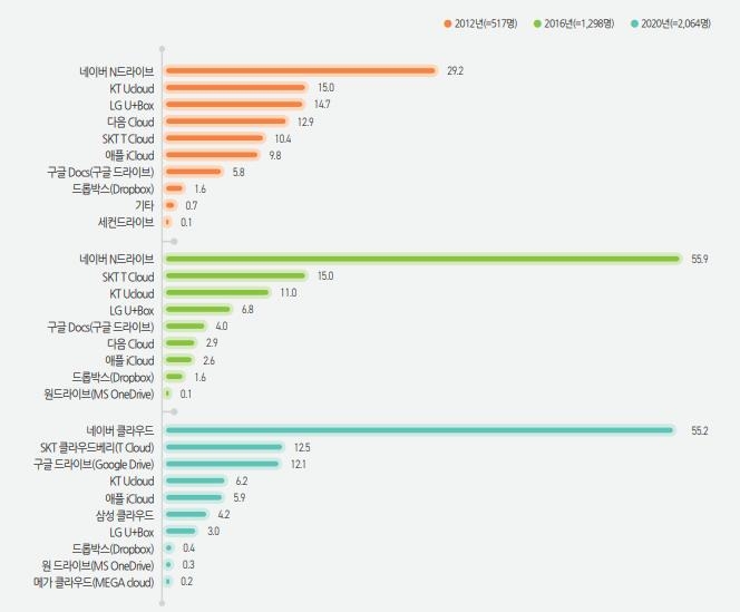 반면 구글 드라이브는 2016년 4.0%에서 2020년 12.1%로, 애플 아이클라우드는 2016년 2.6%에서 2020년 5.9%로 이용률이 2~3배가량 성장했다.
