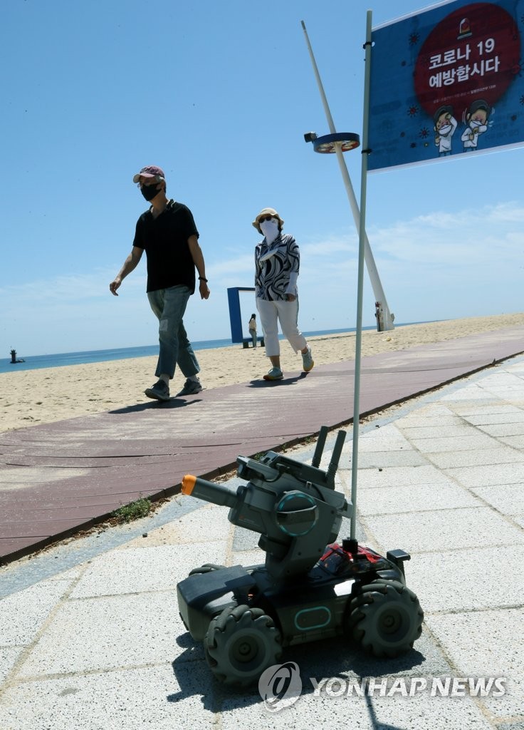 | ▲ 마스크 착용 안내하는 로봇 경포해변에 등장 (강릉=연합뉴스) 이해용 기자 = 지난 4일 강릉시가 해수욕장 개장을 앞두고 경포해변에서 마스크 착용을 안내하는 로봇을 선보이고 있다. 이 로봇은 마스크를 쓰지 않은 사람을 감지하면 따라가 안내 방송을 한다. 2021.6.4 dmz@yna.co.kr |