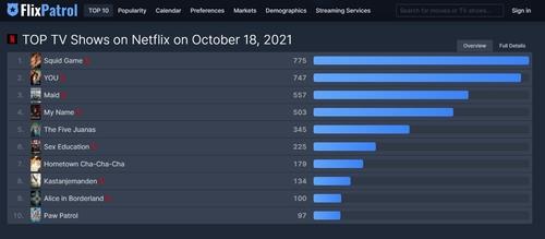 한국 드라마가 OTT(온라인 동영상 서비스) 세계 순위 10위권에 진입하는 건 예삿일이 됐다. 글로벌 순위 사이트 '플릭스 패트롤'을 보면 '오징어 게임'이 한달 넘게 1위를 지키는 동안 '마이 네임', '갯마을 차차차', '연모'도 순위에 이름을 올렸다.