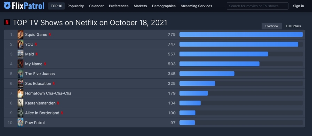 (서울=연합뉴스) 김정진 기자 = '오징어 게임'에 이어 '갯마을 차차차'와 '마이 네임'까지 넷플릭스 TV 프로그램 부문 전 세계 톱(TOP)10에 이름을 올리며 한국 드라마의 세계적 흥행이 지속되는 모양새다.