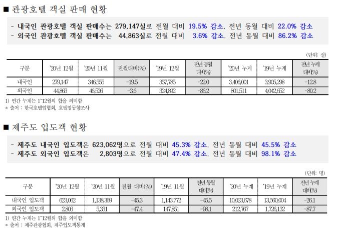 지난해 12월에는 27만9천147개가 팔려 1년 전보다 22.0% 줄었다. 코로나19 3차 유행에 따른 사회적 거리 두기 강화로 관광업계 연말 성수기가 고스란히 사라진 것이다.