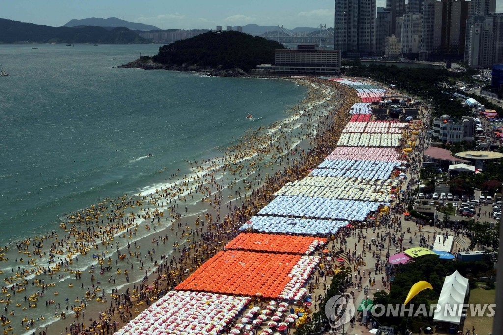 | ▲ 2008년 8월 2일 기네스북에 등재된 부산 해운대 파라솔 물결 [조정호 기자] |