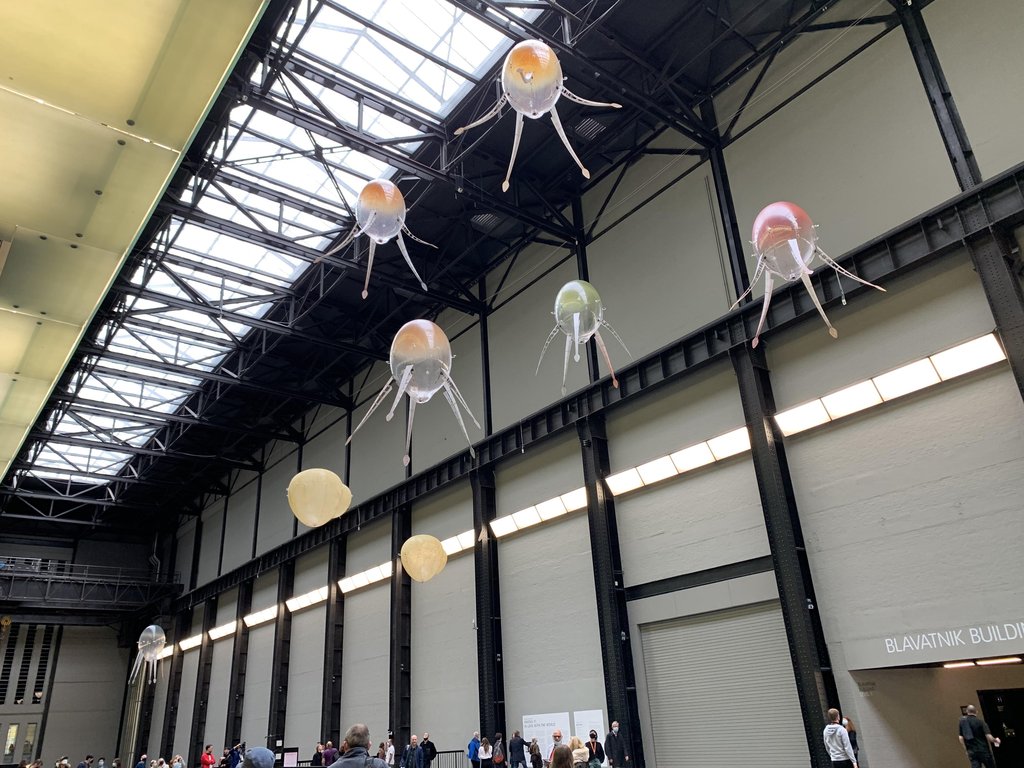 | ▲ 영국 테이트 모던 '현대커미션: 아니카 이' 전시 (런던=연합뉴스) 10월 11일(현지시간) 영국 런던 테이트 모던 터바인홀에서 '현대 커미션: 아니카 이 : 인 러브 위드 더 월드' 전시를 하루 앞두고 전시 사전관람회가 개최됐다. 사진은 해파리 등 해양 생명체 모양의 전시물. 2021.10.18 photo@yna.co.kr |