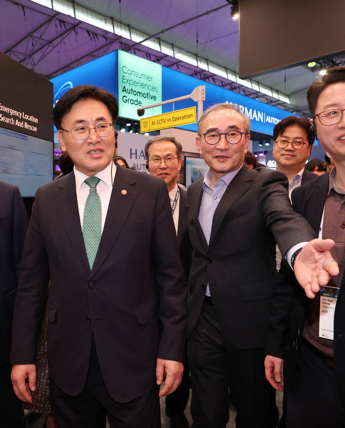 South Korean Science and ICT Minister Yoo Sang-im (L), accompanied by KT Corp. chief Kim Young-shub, visits the booth of the major telecom operator in South Korea at the Mobile World Congress fair, the world's largest annual gathering of the mobile communications industry, in Barcelona on March 3, 2025. (Pool photo) (Yonhap)