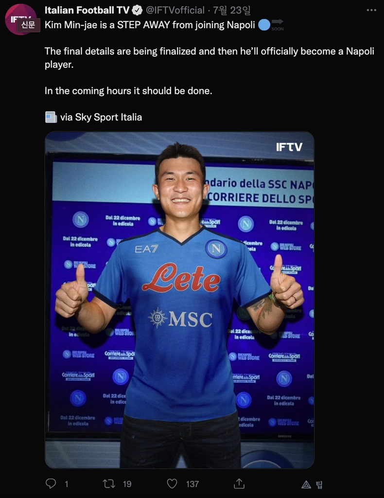 그러면서 "김민재가 나폴리 입단에 '한 걸음'만을 남겨두고 있다"고 적었다.