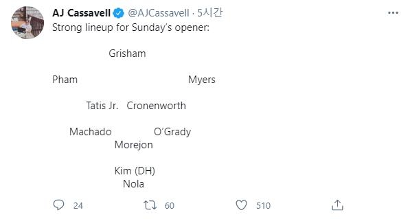 MLB닷컴 샌디에이고 담당 기자 A.J. 카사벨은 28일 자신의 소셜네트워크서비스에 '3월 1일 시범경기 개막전 선발 라인업'을 공개했다.