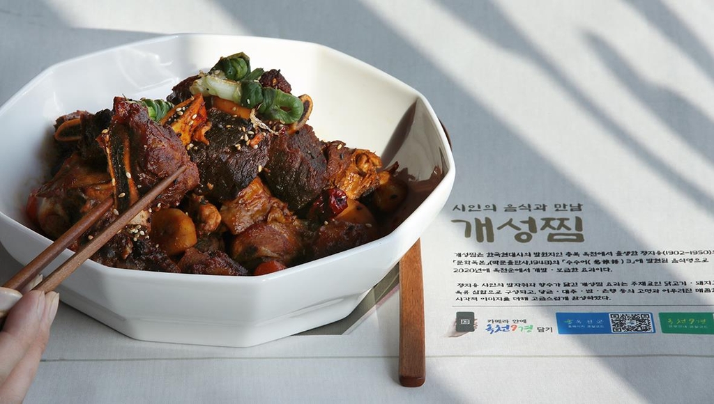 ▲ 정지용의 작품 속 음식을 재현한 지용 밥상. 주메뉴인 개성찜에 다양한 반찬이 곁들여진다. [사진/전수영 기자]