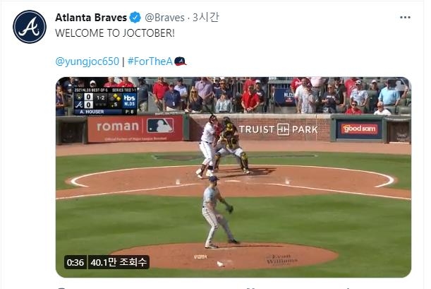 (서울=연합뉴스) 하남직 기자 = 미국프로야구 애틀랜타 브레이브스는 12일(한국시간) 구단 공식 트위터에 '웰컴 투 족토버(WELCOME TO JOCTOBER)!'라고 썼다.