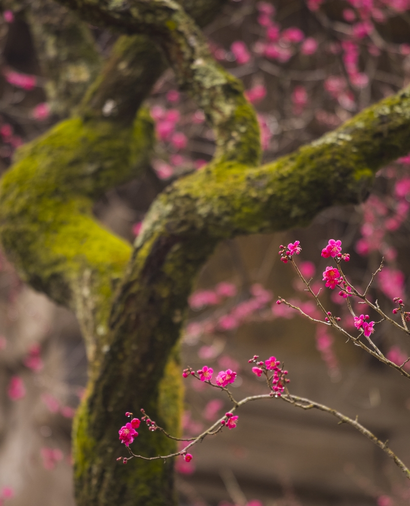특히 오래된 고목답게 녹색 이끼가 온통 덮여 있는 나무 기둥을 배경으로 피어난 새빨간 매화는 더없이 아름다웠다.