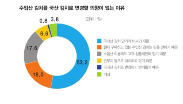수입산 김치를 국산으로 바꾸지 않는 이유로는 53.2%가 국산 김치 단가가 비싸다는 점을 들었다. 이어 '현재 구매하는 수입산 김치는 믿을 만해서'(18.0%), '수입산을 이용해도 고객 항의가 없어서'(17.6%), '단무지 등으로 대체하고 있기 때문'(6.6%) 등이었다.