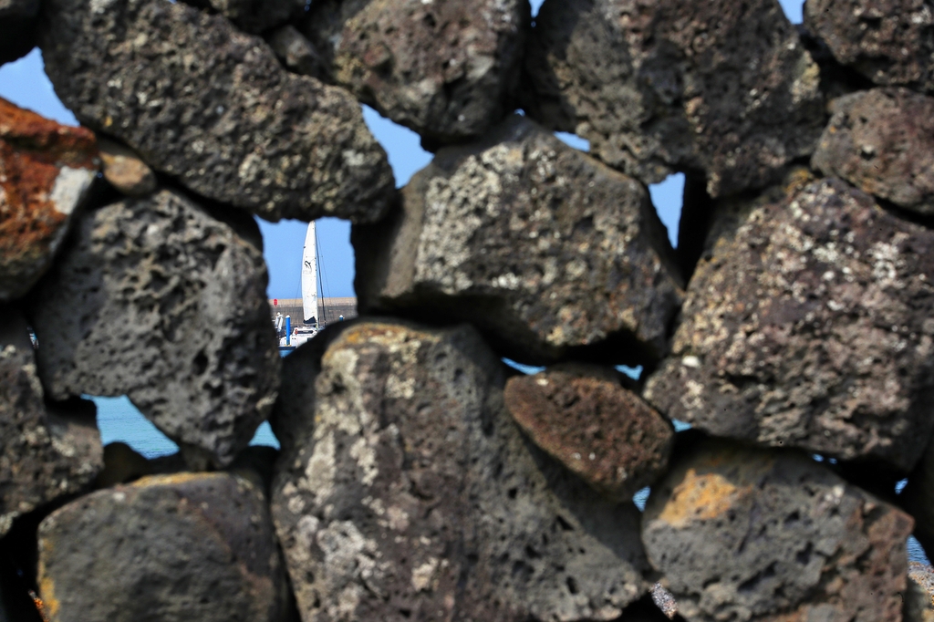 ▲ 김녕리 바닷가에 쌓은 신당(갯당)의 돌담 틈새로 바다 풍경이 보인다. 태풍에도 무너지지 않는 돌담의 비밀이 바로 이 틈새에 있다. [사진/전수영 기자]