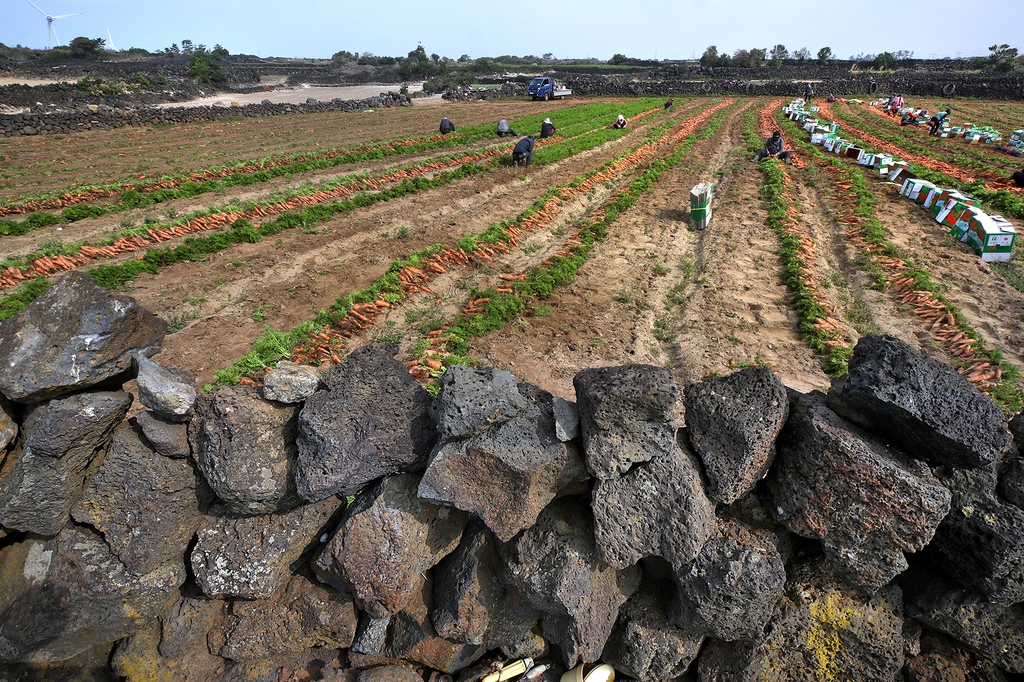 담 너머 보이는 밭의 모습도 각양각색이다. 푸릇푸릇한 마늘밭과 쪽파밭, 노란 물결이 일렁이는 유채꽃밭, 당근 캐는 손길로 분주한 밭, 이미 수확을 마치고 검붉은 흙을 드러낸 밭, 빌레 사이에 조성된 조그만 돌랭이 밭…