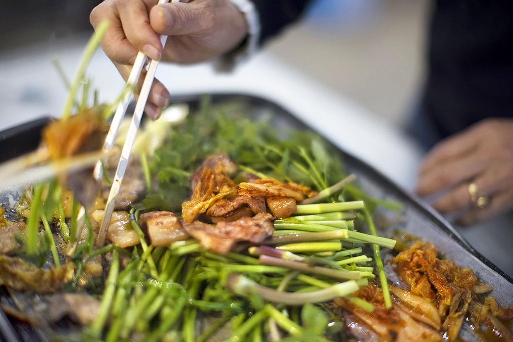 | ▲ 인흥마을 주변에서 손님들이 미나리를 삼겹살에 구워 먹는 모습 [사진/성연재 기자] |