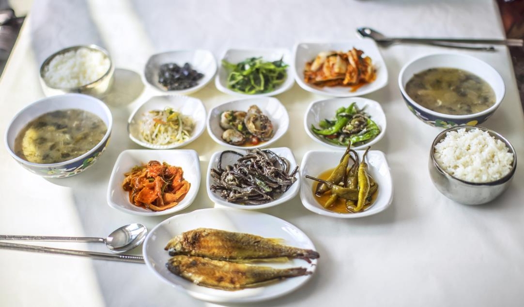 국과 밥을 제외하고 꽈리고추 멸치볶음과 꼬막무침, 조기 등 모두 10가지 반찬이 가지런히 놓인다.