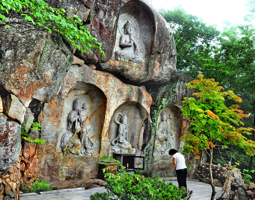 사천왕문도 독특하다. 여느 절 같으면 누각 안에 나무로 조각한 사천왕들이 서 있을 텐데 돌기둥을 지나 돌계단을 오르다 보면 오른쪽 이끼 낀 바위 절벽에 정교하게 조각된 사천왕을 만나게 된다.