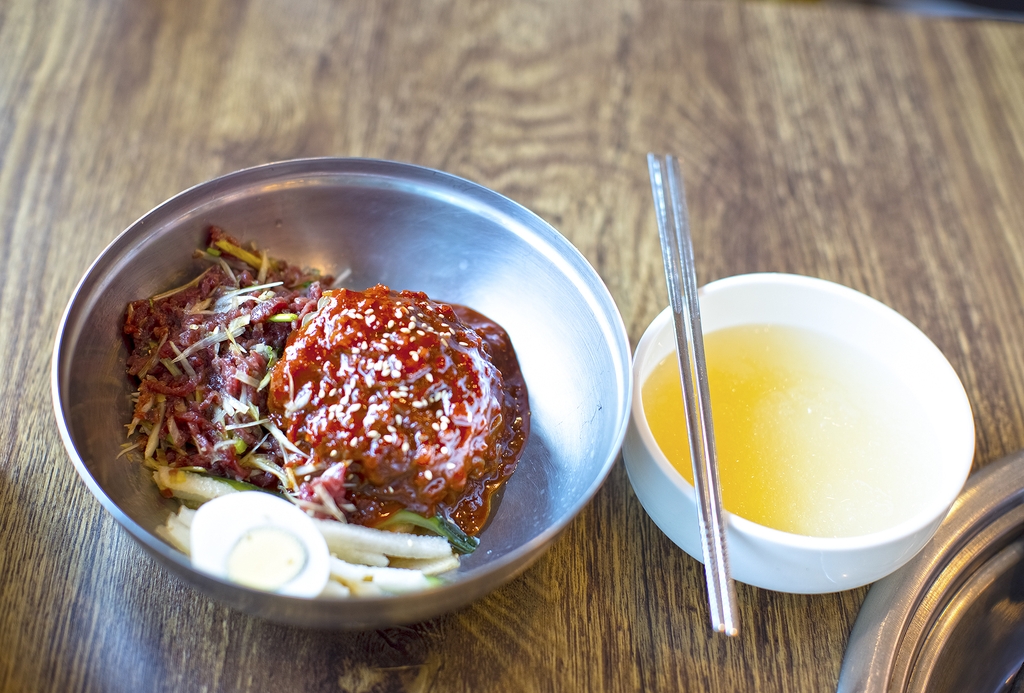 육회를 올린 냉면도 빼놓을 수 없다는 말에 배가 너무 부른 상태였지만, 맛을 볼 수밖에 없었다. 신선한 육회 맛이 냉면의 식감과 잘 어울렸다. 배고플 때 먹었으면 더 맛있었을 듯했다.