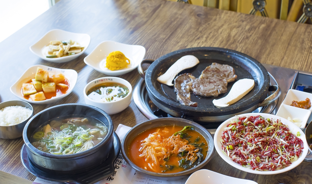 ▲ 문경약돌한우탕과 무·미역 채, 육회, 쇠고기 등심(왼쪽부터 시계 반대 방향) [사진/성연재 기자]