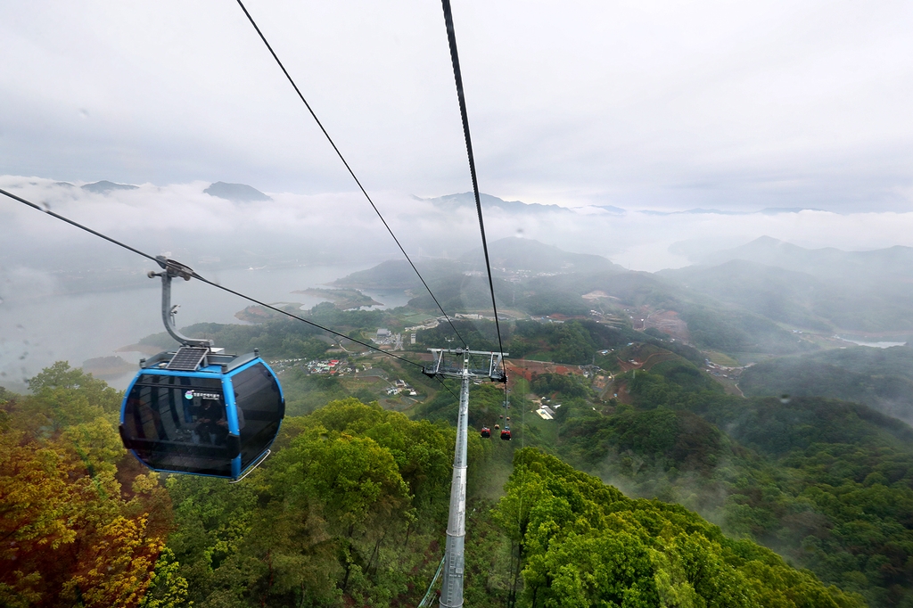 케이블카는 청풍면 물태리에서 비봉산 정상까지 2.3㎞를 9분 만에 운행한다. 케이블카를 타고 비봉산 제일 높은 곳에 오르니 360도 사방에 가득 펼쳐진 게 연봉으로 이어진 수려한 산과 푸른 호수였다.