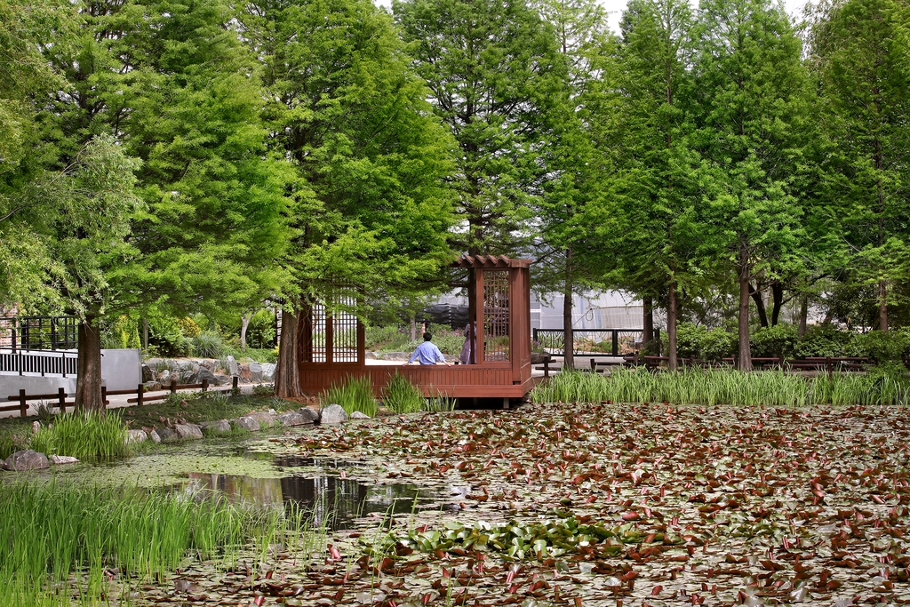 정자가 있는 수생식물원의 풍경 쉼터는 수목원 내 최고의 포토 스폿으로 꼽힌다. 주말이면 '인생샷'을 건지려는 줄이 길게 늘어선다.