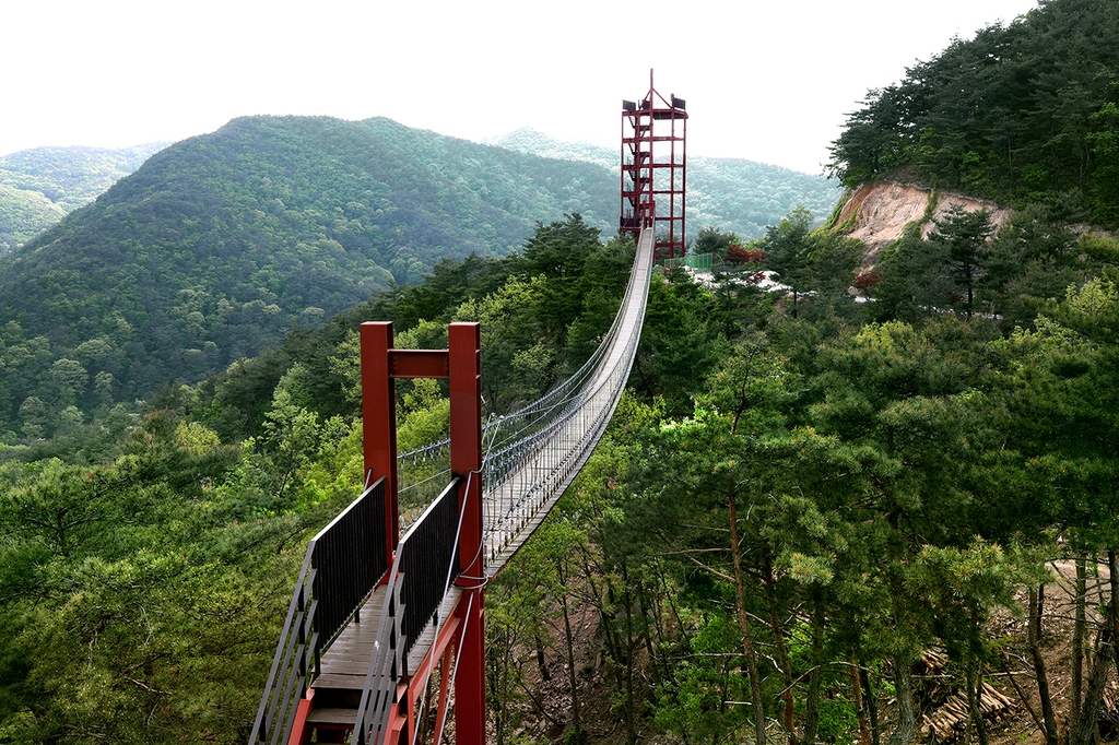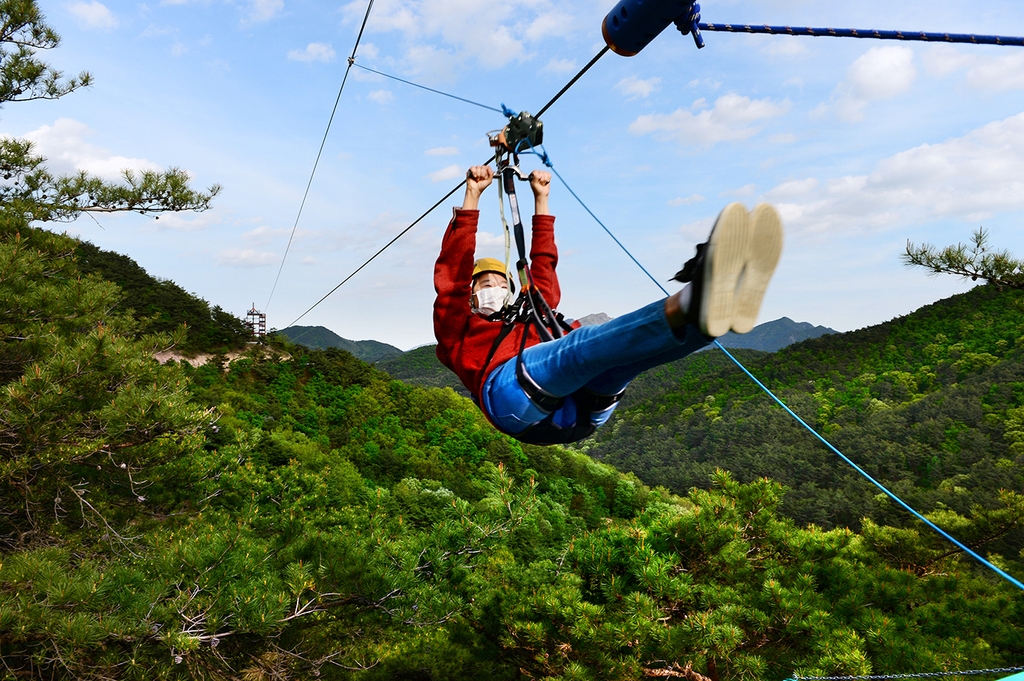 '속리산 집라인'은 공중에서 스릴을 만끽하며 말티재와 속리산의 풍광을 즐길 수 있는 산악 집라인이다.