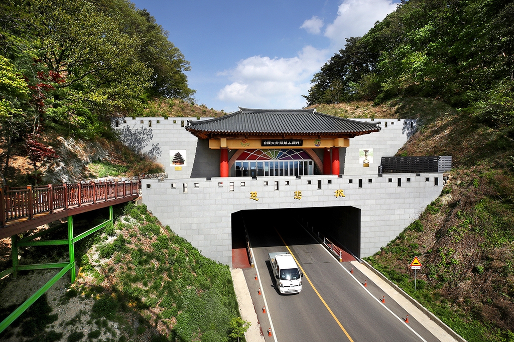 터널 상층부의 기와를 얹은 건물 위에 흙을 쌓고 소나무 등 자생식물을 심어 야생동물이 오갈 수 있는 생태 숲을 조성했다.