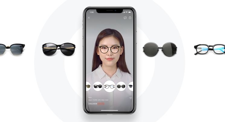 고객이 얼굴 사진을 찍어 올리면 다양한 안경테 제품을 착용한 모습을 보여준다. 카메라 앞 얼굴 움직임에 따라 안경테 위치도 실시간으로 조정되는 증강현실(AR) 서비스도 있다.