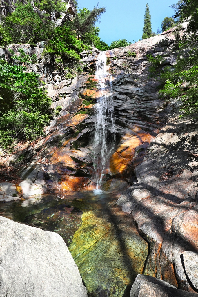 출렁다리에서 밑을 내려다보면 우리나라에 이렇게 좁고 깊은 계곡이 있었나 싶다. 협곡 사이에는 가느다란 폭포가 길게 뻗어 있었다. 폭포 중간과 끝에는 용소, 용담이라는 웅덩이가 형성돼 있다.