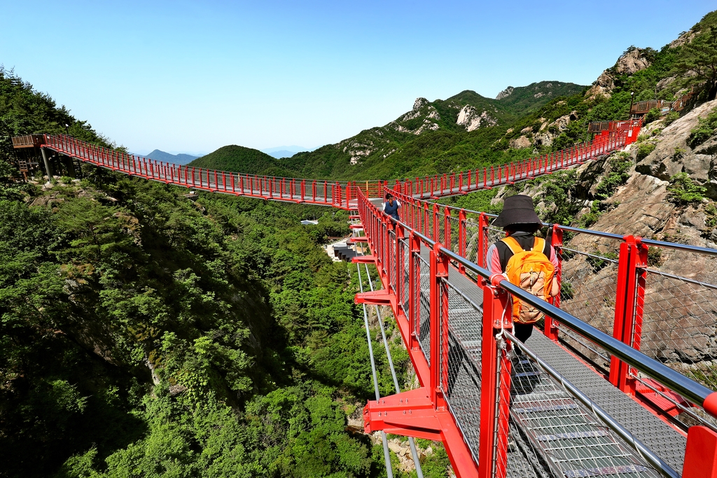 오르막길에는 576개 나무계단이 만들어져 있다. 나무계단을 꾸준히 오른 뒤 출렁다리에 이르면 위로는 가슴을 탁 트이게 하는 산과 하늘에 취하고, 아래로는 숨 막히게 아찔한 협곡에 현기증을 느끼게 된다. 케이블카에 올랐을 때보다 신나고, 롤러코스터 탈 때보다 어지럽다.