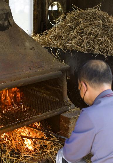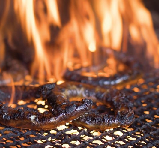 곰장어를 큰 석쇠 위에 올린 뒤 아래쪽에 불이 꺼지지 않도록 계속 짚을 넣는다. 짚을 넣자마자 큰 불길이 위로 올라온다.