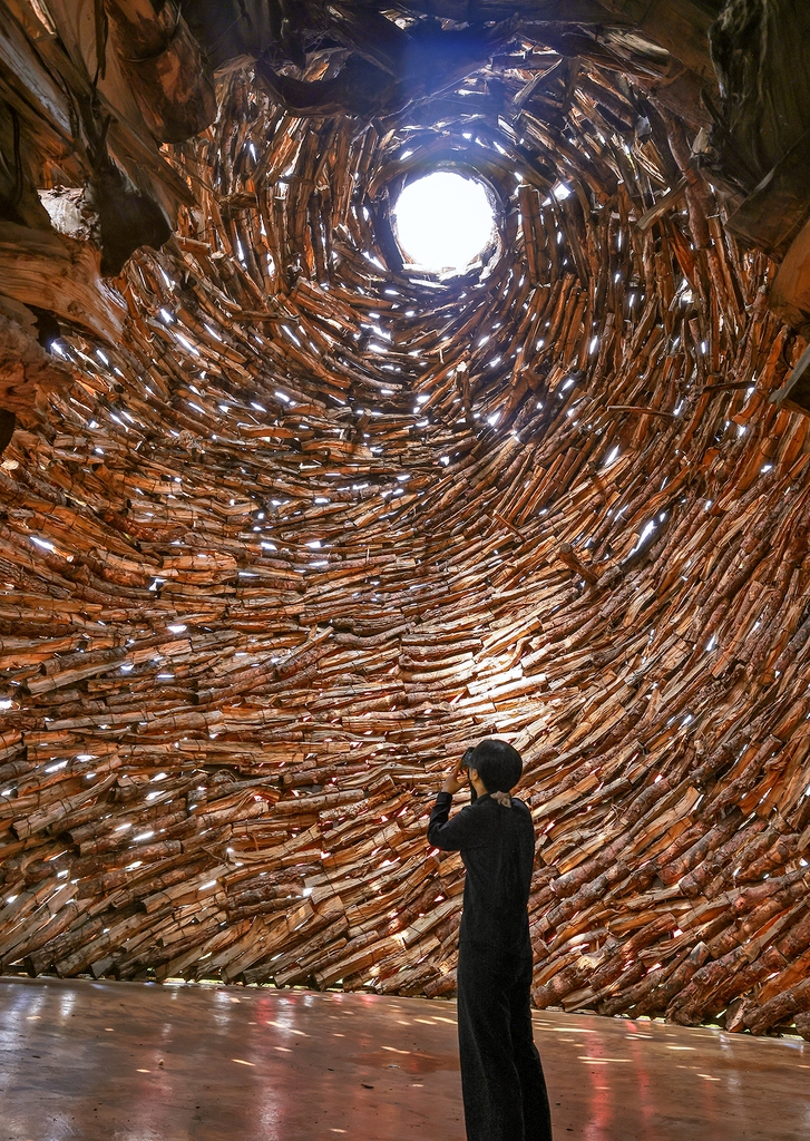 거대한 소나무 장작더미를 쌓아 올려 만든 최 작가의 설치미술 '목성'(木星)도 눈에 띈다. 원초적인 자궁의 힘, 사랑 등의 의미를 담았다고 한다.