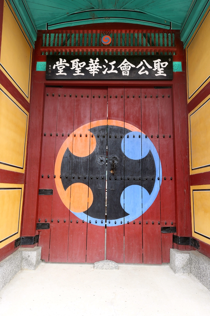 스물두 개의 계단을 올라가면 세 개의 문으로 이뤄진 정문, 즉 외삼문을 마주하게 된다. 외삼문에는 십자가를 품은 태극 문양이 새겨져 있다.