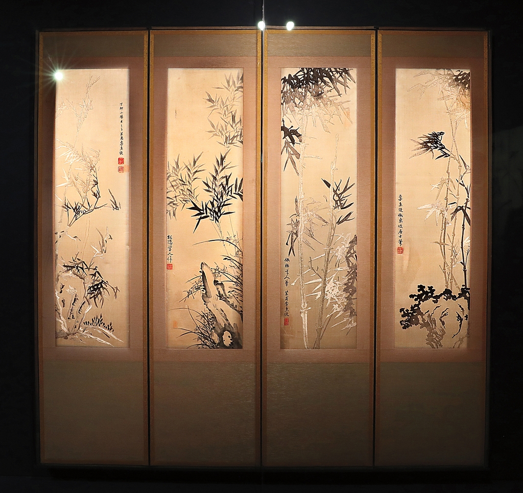 ▲ 그림과 자수를 비교해 볼 수 있는 '자수 목죽도 4폭 병풍'. 오른쪽에서 세 번째 폭이 그림이고 나머지는 자수다. [사진/조보희 기자]