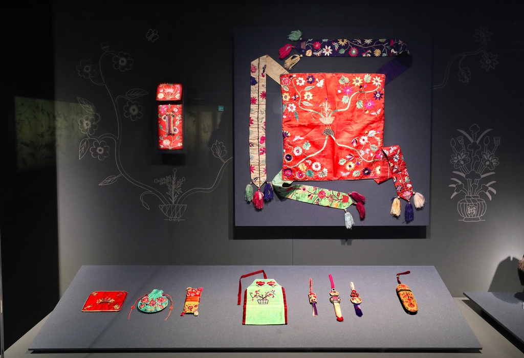 2층 '자수, 꽃이 피다'에서는 커다란 자수 병풍을 비롯해 주머니, 안경집, 보자기와 옷, 신발 등 일상생활에서 썼던 다양한 자수 공예품을 만날 수 있다. 대부분 19∼20세기 제작된 작품들이다.