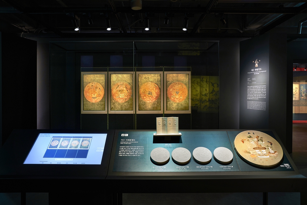 자수 작품의 경우 터치스크린을 통해 작품 곳곳을 확대해 보면서 어떤 재료로 어떤 자수 기법을 써서 수를 놓았는지 살펴볼 수 있다.